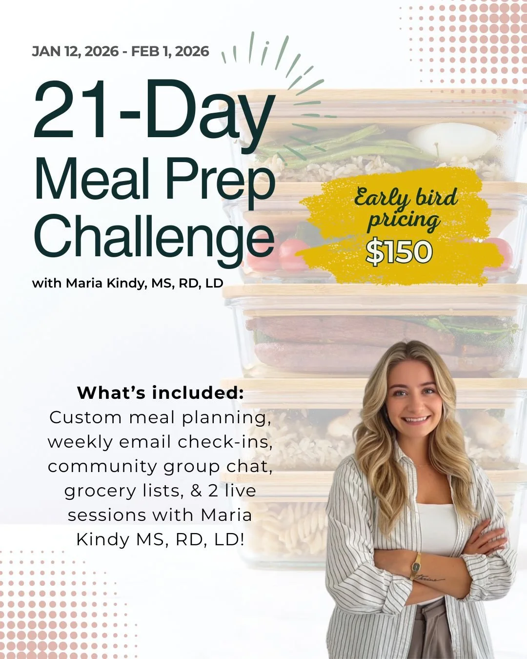 Build simple, sustainable meal prep habits in just 21 days. This guided group challenge, led by our registered dietitian Maria, includes done-for-you meal plans, grocery lists, weekly tips, and accountability to help you save time, reduce stress, and stay consistent with nourishing meals—without perfection or overwhelm.